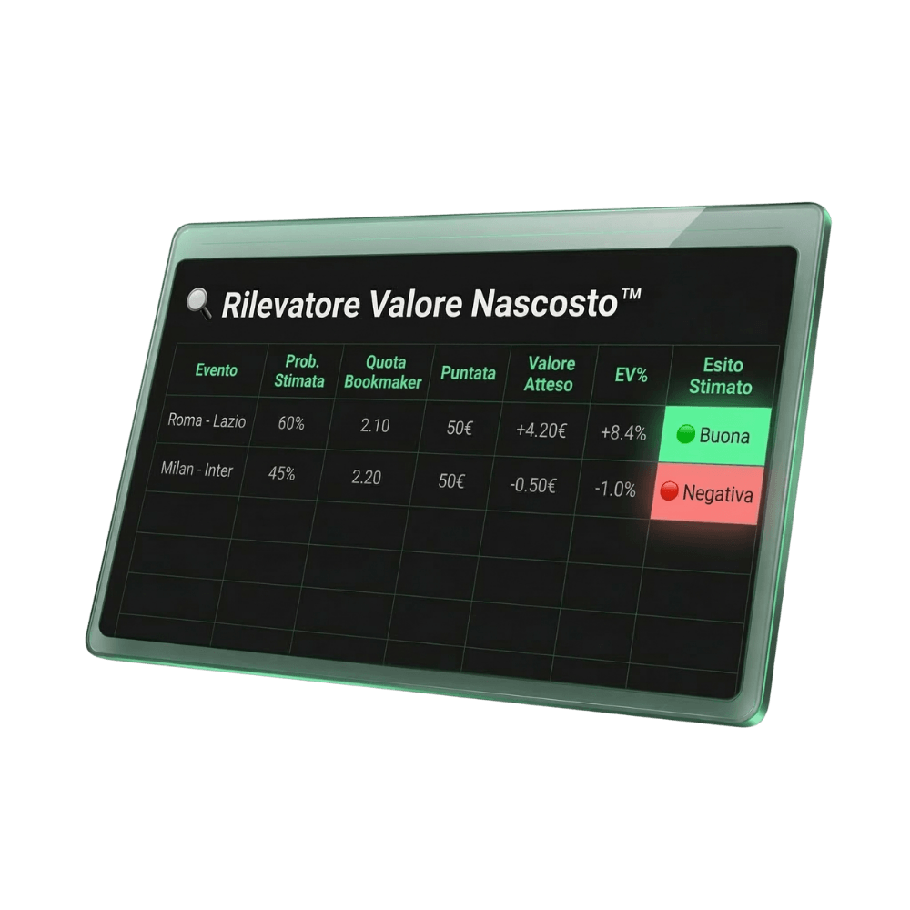 Inserisci probabilità stimata, parametro di mercato e capitale: il foglio calcola automaticamente il valore atteso (EV%) e il profitto teorico (EV €). Uno strumento logico e preciso per distinguere le vere opportunità dal rumore del mercato.