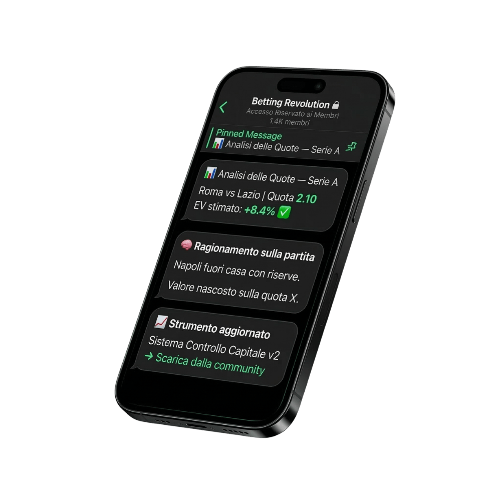 Entri nella community Telegram Ricevi l'invito esclusivo ai nostri canali riservati. Troverai analisi dei mercati, ragionamenti sulle partite e modelli decisionali condivisi ogni giorno da chi ragiona sul calcio con logica.